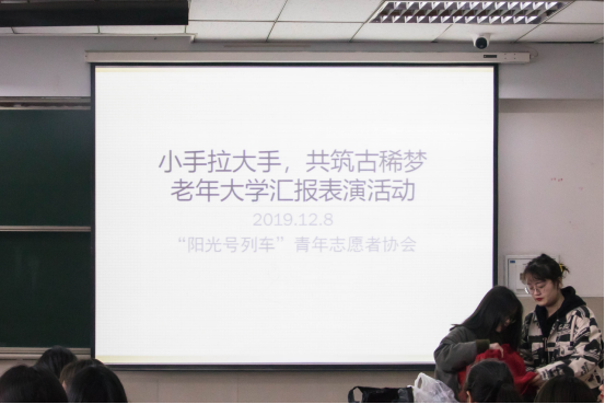 (摄/郑甜 罗娜 文/韩思洁 范期明为弘扬志愿者“奉献、有爱、互助、进步”的精神,同时向老人们传递关爱与温暖,12月8日上午九时三十分,公司阳光号列车全体成员在14教南小广场开展了主题为“小手拉大手,共筑古稀梦”的汇报表演活动。志愿者、老人们共同参与。
