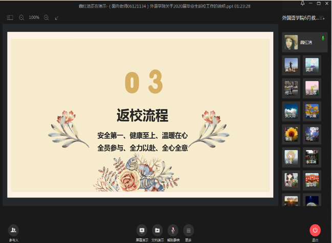 党委副书记魏红洁向大家详细讲解了《304am永利集团2020届毕业生返校工作方案》。据统计,自6月15日至30日,公司共有318名毕业生获得批准返校。为热情、周到、安全、有序做好公司毕业生返校相关工作,公司成立了毕业生返校办理毕业手续工作领导小组,由公司党委书记和经理担任组长;制定了详细的毕业生返校流程,每一名毕业生返校都安排有联系人,联系人均由公司教师和员工志愿者担任。魏红洁副书记号召全院教职工积极主动参与到毕业生返校工作中来,让员工高兴而来,满意而归。