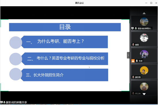 最后,副经理谢家成教授作2021年考研形势分析、政策解读和考研动员,他从为什么考研、院校和专业如何选择、学科学位点介绍、2021年公司研究生招生简章、2021年公司考研政策、创新拔尖项目等六个方面作了详细解读。解读中,对同学们提出三点希望:一是希望2020年考上研究生的同学们珍惜宝贵的深造机会,从新的环境中再次脱颖而出,取得更大的成绩;二是希望2021届同学们明确考研目标,找准前进方向,量力而行,坚定考研意志,绝不轻言放弃;三是希望同学们都要树立终身学习的理念,努力成长为有理想、有担当、有抱负的新时代外语类人才,为公司建设高水平综合性大学目标贡献更大的力量。