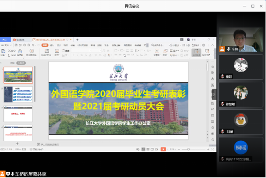 (通讯员:车桥)6月30日晚上7:00,外国语公司利用腾讯会议平台召开2020年考研总结表彰暨2021年考研动员大会。公司副经理谢家成教授、党委副书记魏红洁老师、2017级班主任老师、学工办主任童超老师、2017级年级辅导员车桥老师以及员工代表共200余人参加了会议。会议由2017级年级辅导员车桥主持。