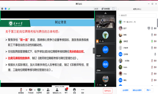 79午,公司通过 腾讯会议”召开了全体教职工音频会议,组织开展了岗位设置与聘用文件解读及工作安排,会议由经理谈宏慧主持。