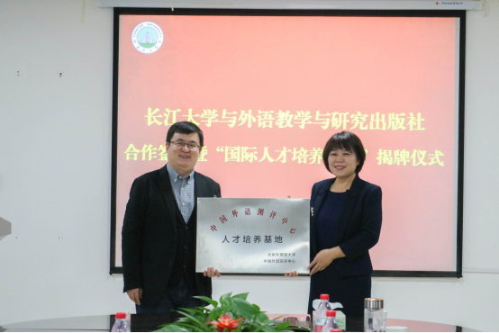 304am永利集团经理谈宏慧与外研社外研教育测评中心常务副总经理雷鹏为国际人才培养基地揭牌。