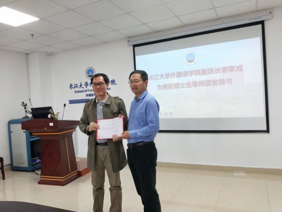 副经理谢家成教授向出席仪式的兼职导师颁发聘书。他们分别是第二批荆楚教育名家毛庆龙、荆州市教科院英语教研员陈勇、沙市区教育科学研究院英语教研员钟传银、荆州中学英语名师李云标、沙市实验中学英语特级教师邱煜。