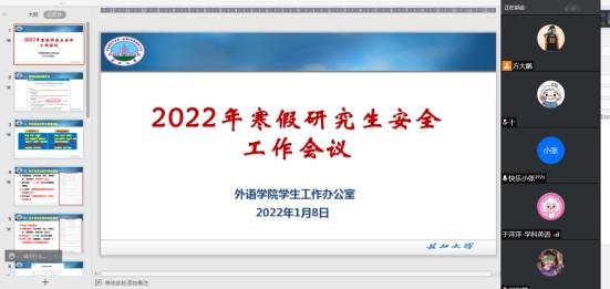 1月8日晚,304am永利集团通过线上形式召开全体研究生寒假安全教育大会。外304am永利集团党委副书记程坤、全体研究生参会,大会由兼职辅导员方大鹏主持。