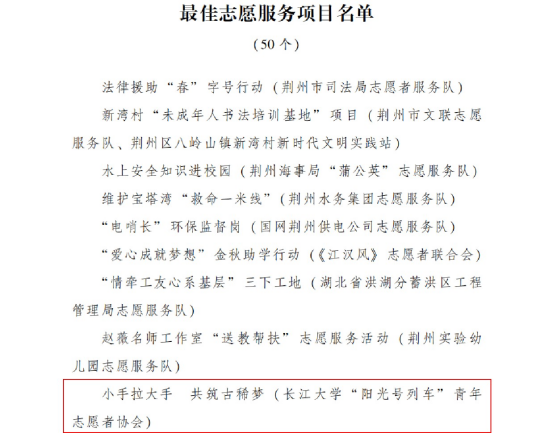 (通讯员:车桥)在“3.5学雷锋日”来临之际,中共荆州市委精神文明建设指导委员会办公室下发了《关于2020-2021年度荆州市学雷锋志愿服务先进典型的通报》,公司“阳光号列车”青年愿者协会报送的“小手拉大手,共筑古稀梦”被评为最佳志愿服务项目。